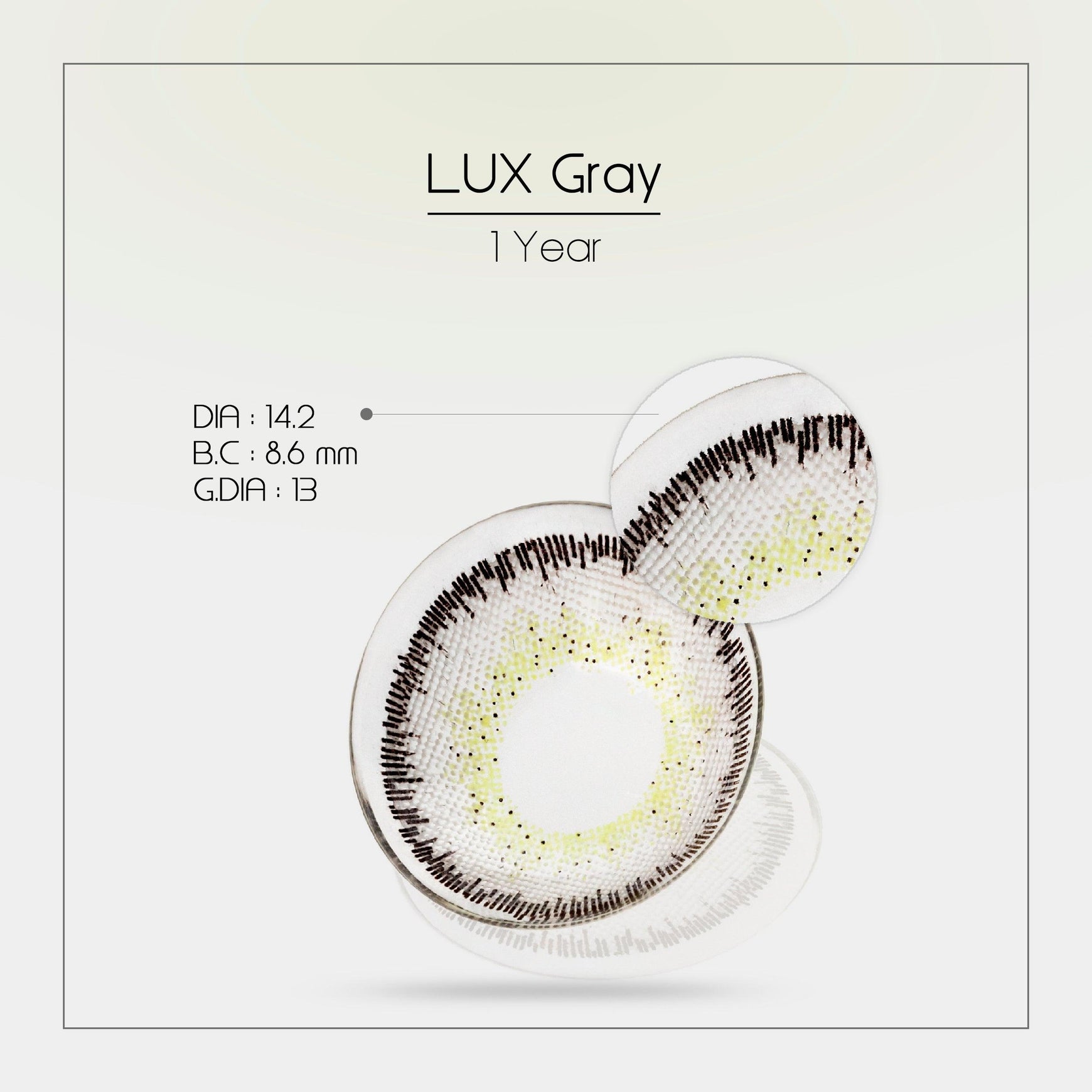 Cast a spell on every onlooker with the Lux Gray. Carefully designed with black specks and a faint yellow tinge around the pupil boundaries, this lens offers a soft gray hue that adds magic to your eyes.